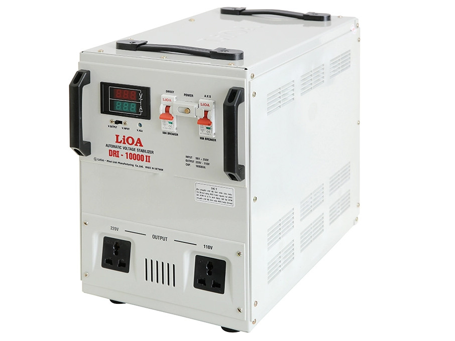 - Ổn áp 1 pha Lioa 10KVA DRI-10000II có dải điện áp đầu vào từ 90V - 250V với điện áp ra 220V / 110V.